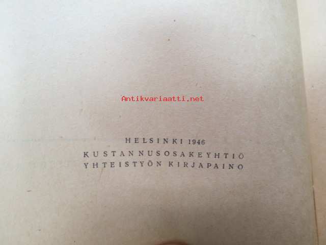 | Saatavilla | 2 kpl | | Julkaisuvuosi | 1946 | | Sivuja | 114 | | Painos | 1. | | Kunto | K2 | | Sidonta/painoasu | Nidottu (pehmeäk.) | | Kielet | Suomi |