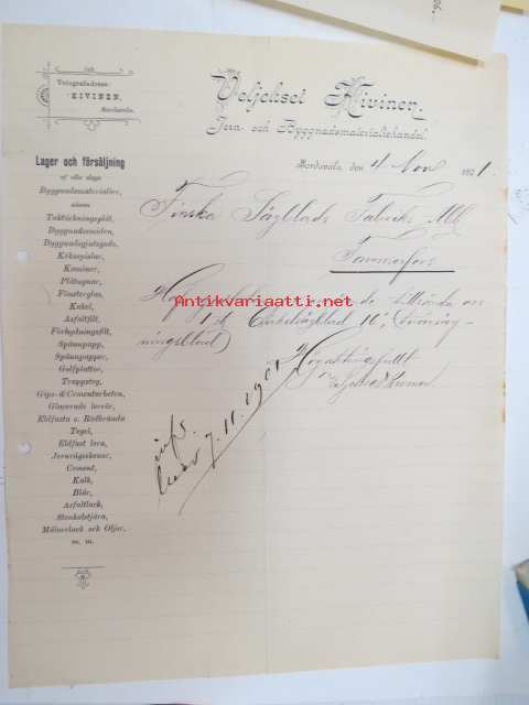 Veljekset Kivinen Oy, Sordavala (Sortavala), 4.11.1901 -asiakirja