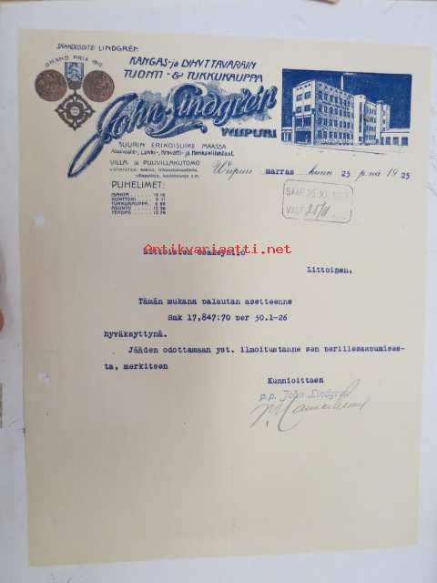 Juho Lindgrén, Wiipuri, (Viipuri) 23.11.1925 -asiakirja