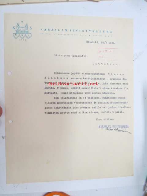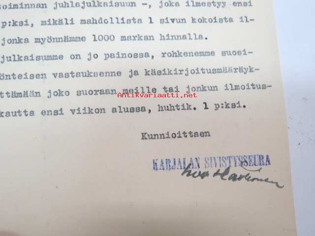 Karjalan sivistysseura, Helsinki, 26.3.1936 -asiakirja