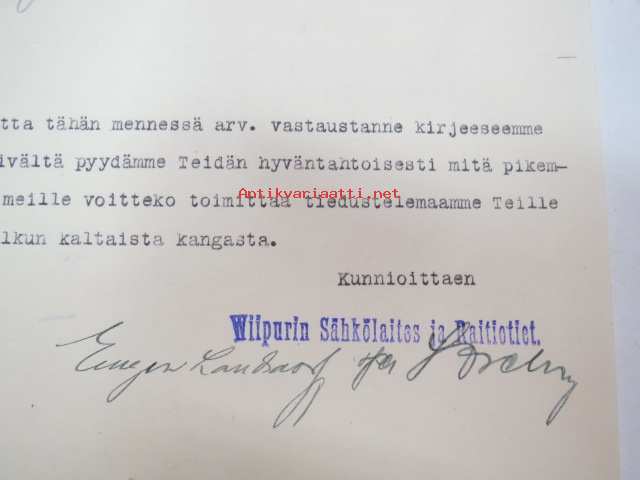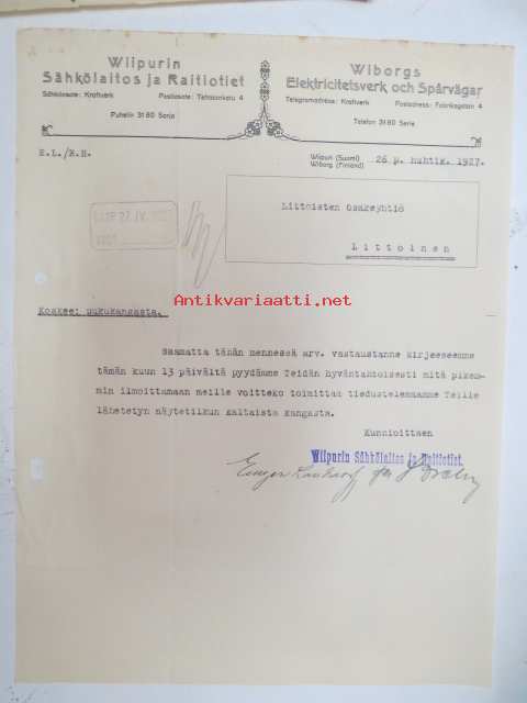 Wiipurin Sähkölaitos ja Raitiotiet - Viborgs Elektricitetsverk och Spårvägar, Viipuri, 26.4.1927 -asiakirja