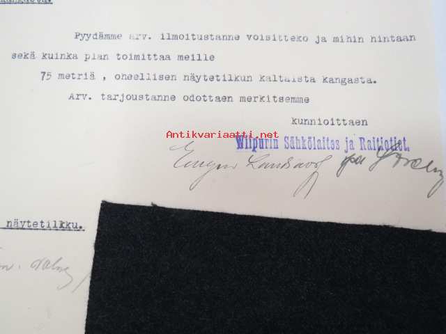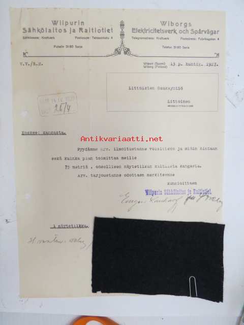 Wiipurin Sähkölaitos ja Raitiotiet - Viborgs Elektricitetsverk och Spårvägar, Viipuri, 13.4.1927 -asiakirja