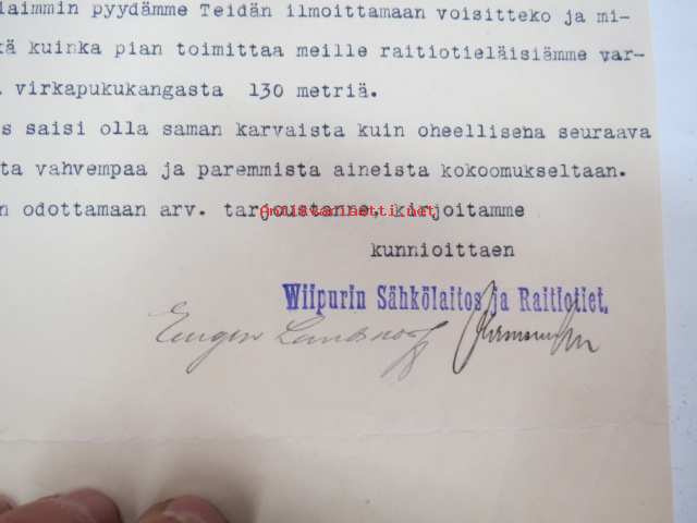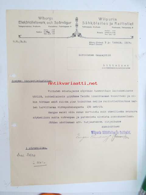 Wiipurin Sähkölaitos ja Raitiotiet - Viborgs Elektricitetsverk och Spårvägar, Viipuri, 9.1.1924 -asiakirja