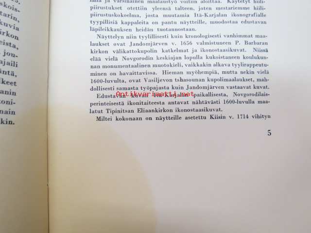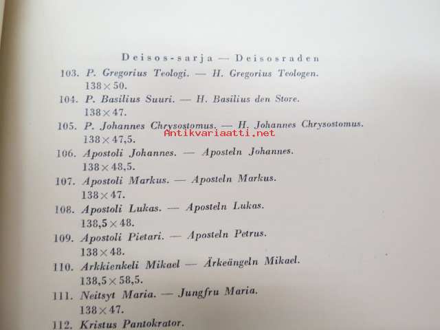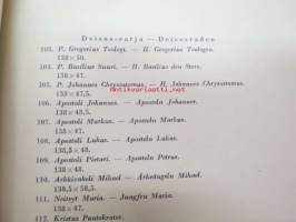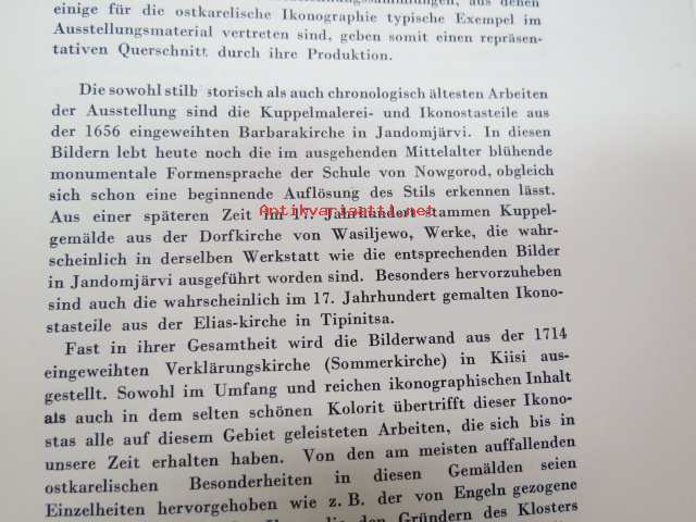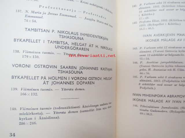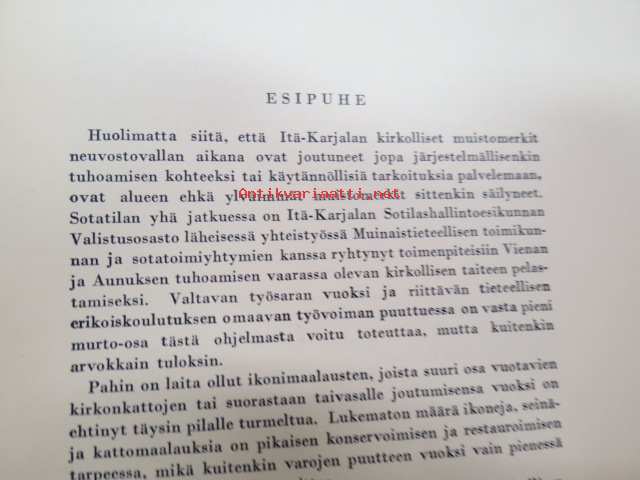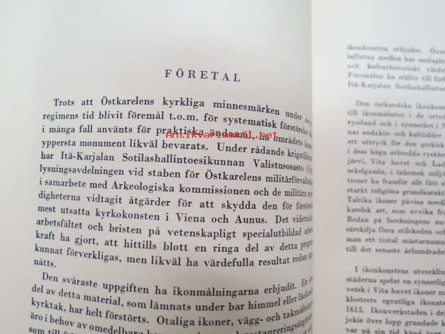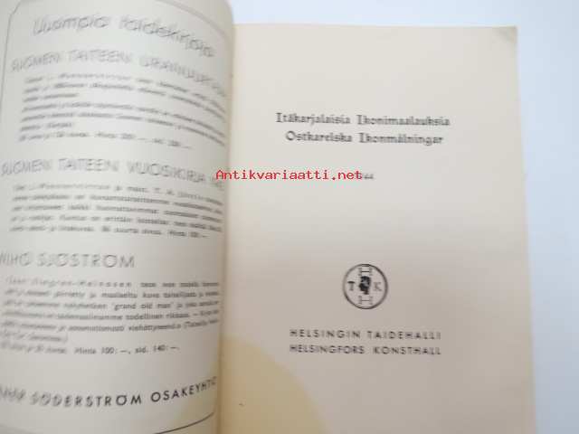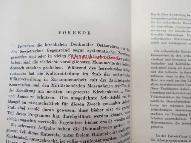 Taiteensuojelua sodan aikana - Itäkarjalaisia Ikonimaalauksia / Konstskydd under kriget - Östkarelska Ikonmålningar -Tammikuussa 1944 pidettäväksi tarkoitetutun Itä-Karjalasta evakuoidun taiteen näyttely, jonka pitämisen Ylipäällikkö Mannerheim esti viime hetkellä, luettelo, jossa esipuhe myös saksaksi