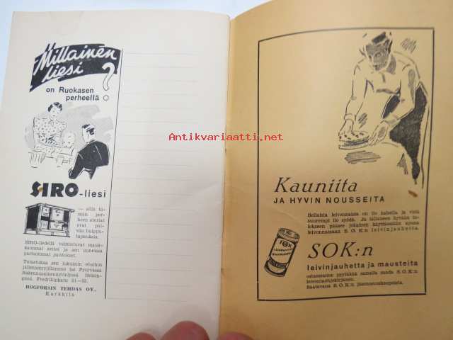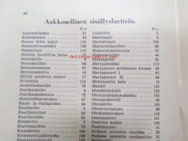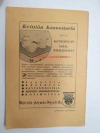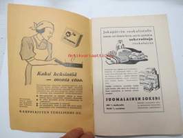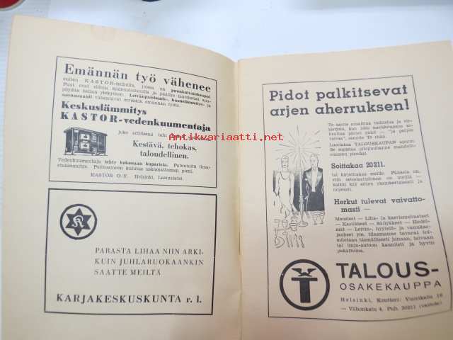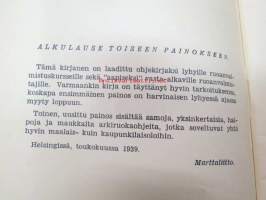 | Saatavilla | 1 kpl | | Julkaisuvuosi | 1939 | | Sivuja | 63 | | Painos | 2. | | Kunto | K2 | | Sidonta/painoasu | Nidottu (pehmeäk.) | | Kielet | Suomi |