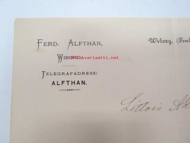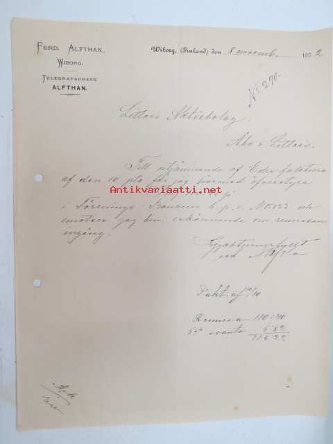 Ferd. Alfthan, Wiborg (Viipuri), 8.11.1902 -asiakirja