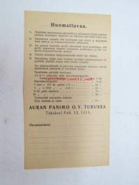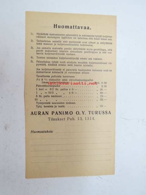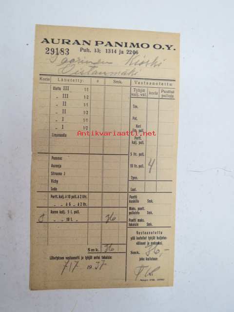 Auran Panimo - Saarinen Kioski Vistanmäki -lähetyskuitti 7.7.1937