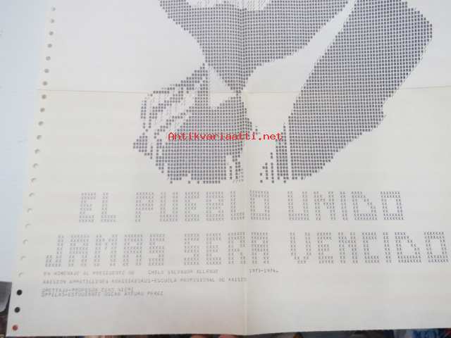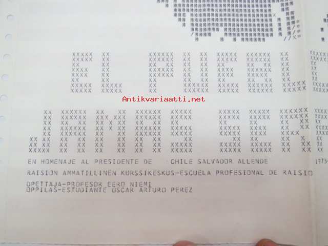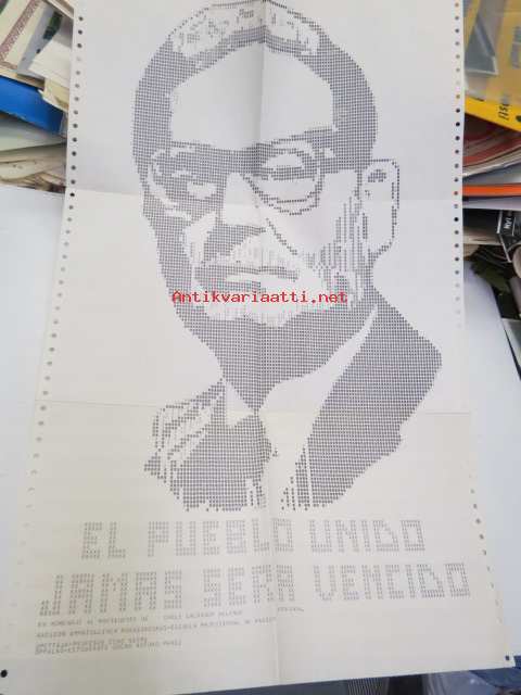 El Pueblo unido - jamas sera vencido - En homenaje al presidente de Chile Salvador Allende 1973-1974 / Raision Ammatillinen Kurssikeskus - Escuelea Profesional de Raisio / Opettaja - Profesor Eero Niemi - Oppilas - Estudiante Oscar Arturo Perez -varhaisella 70-luvun ohjelmointitekniikalla toteutettu muotokuva "tulostinprinttauksena", tekijänä mitä ilmeisimmin eräs noihin aikoihin Suomeen muuttaneista Chilen poliittisista pakolaisista, eipä vaivannut vasemmistolaisuus tuolloin aatteena oppilaitoksissa, sehän oli suorastaan normi?