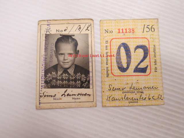 Turun kaupungin liikennelaitos koululaiskortti nr 11138/56 02 -kuukausikortti sekä erillinen kuvallinen tunnistekortti