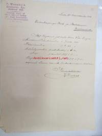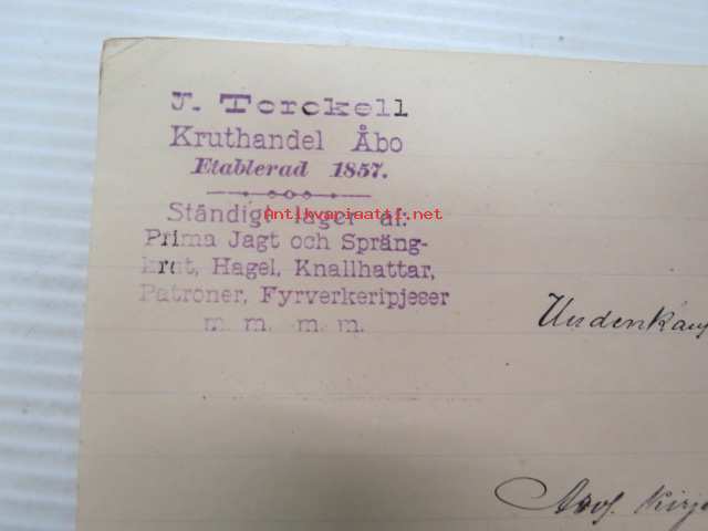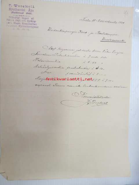 J. Torckell Kruthandel Åbo, Turku / Uudenkaupungin Kone- ja Rautakauppa, Uusikaupunki, 15.11.1910 -asiakirja