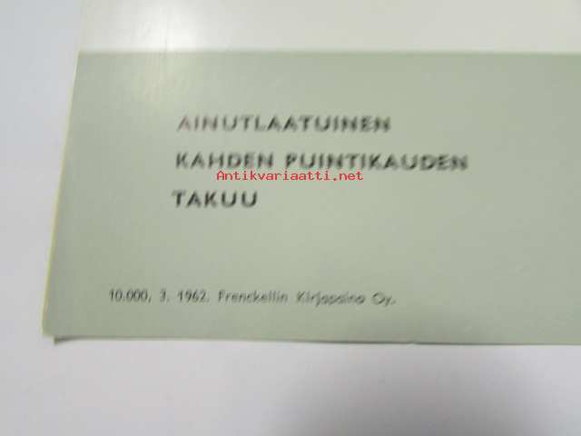 | Saatavilla | 1 kpl | | Julkaisuvuosi | 1962 | | Sivuja | 4 | | Kunto | K3 | | Sidonta/painoasu | Pienpainate | | Kielet | Suomi |