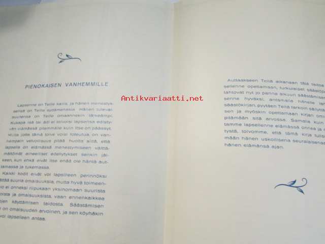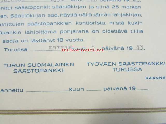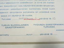 Pienokaiselle ... syntynyt 20.9.1943 Säästöpankin säästökirja ja siinä 25 markan suuruinen talletus 5.11.1943 -lahjakirja