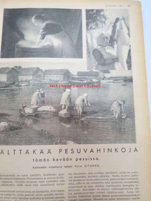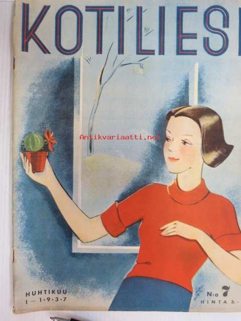 Kotiliesi 1937 nr 7 huhtikuu . Kannen piirtänyt Lea Jännes . Ajankuvaa, muotia ja ruokaohjeita ( mm vehnäsen leipominen) vuodelta 1937.