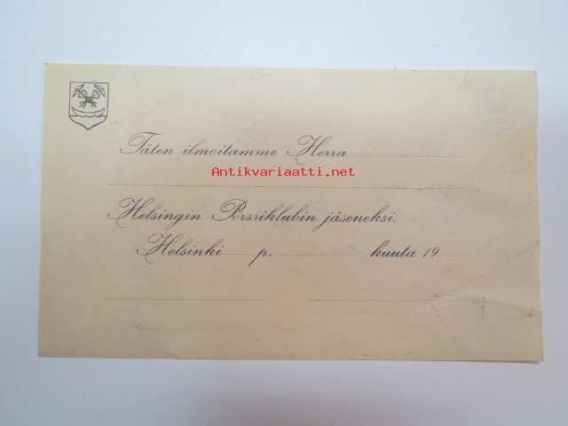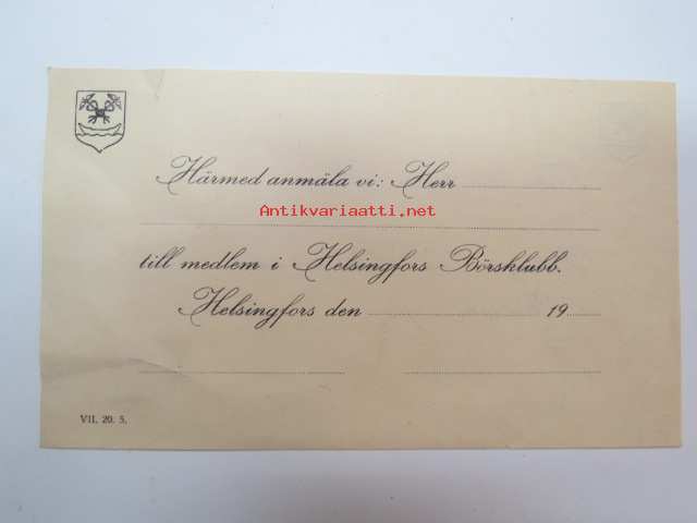 Täten ilmoitamme Herra ............... Helsingin Pörssiklubin jäseneksi / Härmed anmäla vi Herr ............... till medlem i Helsingfors Börsklubb. -ilmoittautumiskortti