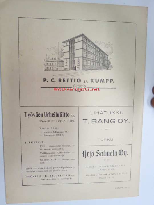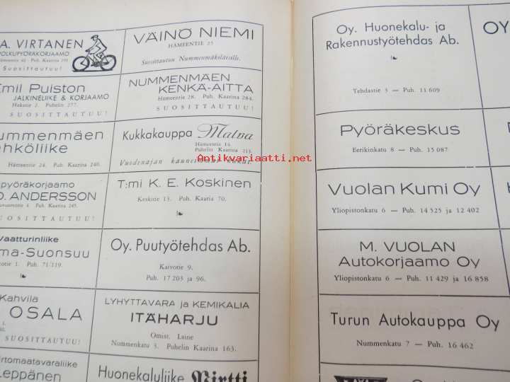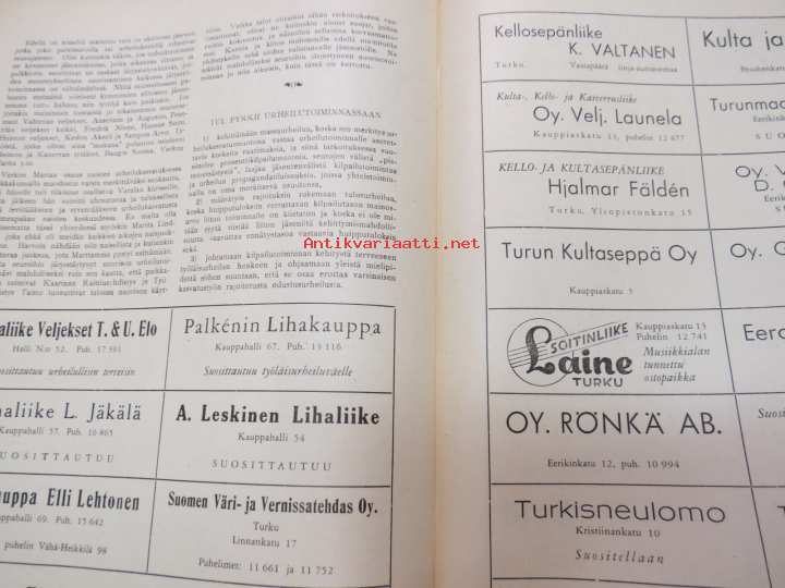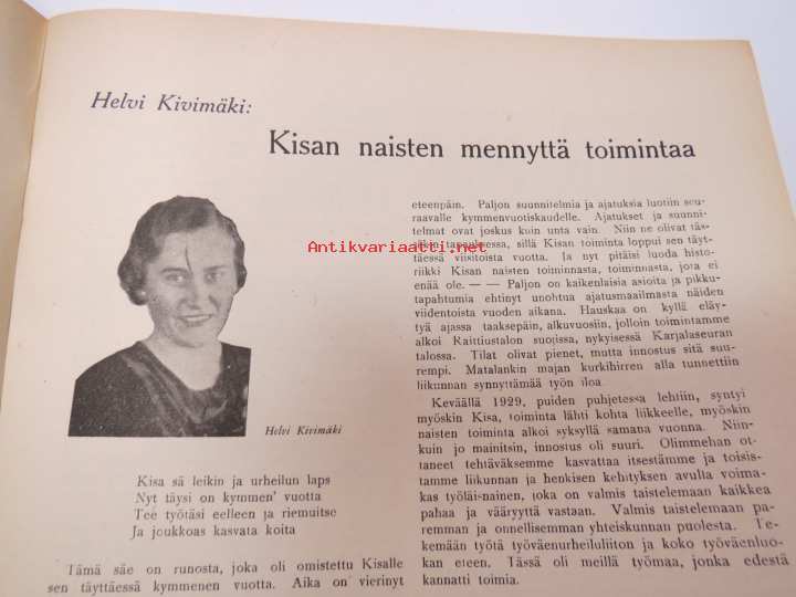 | Saatavilla | 1 kpl | | Julkaisuvuosi | 1946 | | Sivuja | 35 | | Painos | 1. | | Kunto | K3 | | Sidonta/painoasu | Nidottu (pehmeäk.) | | Kielet | Suomi |