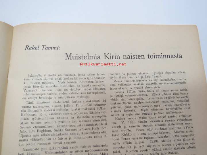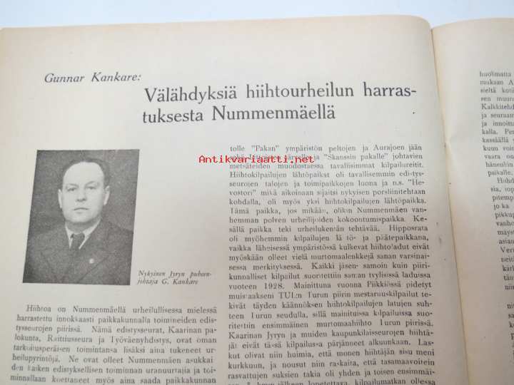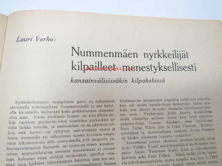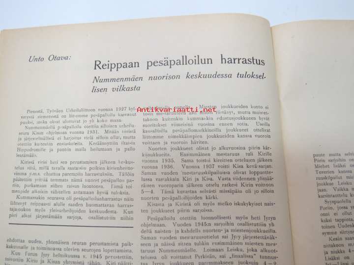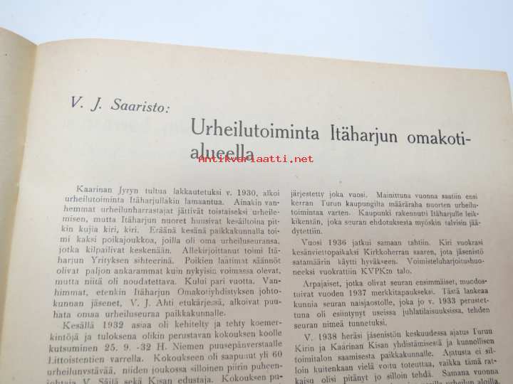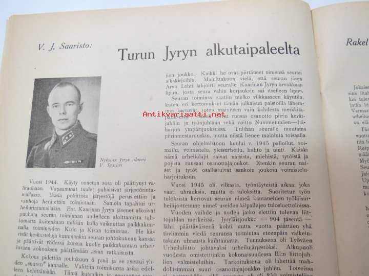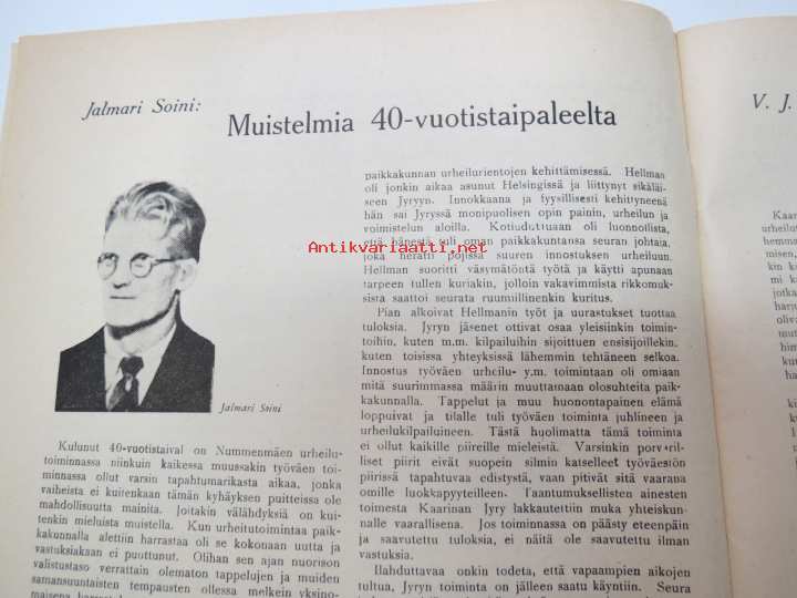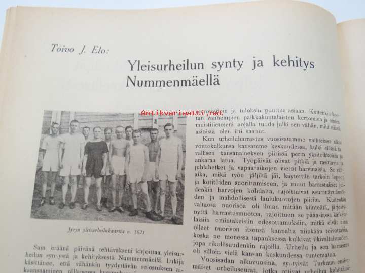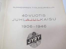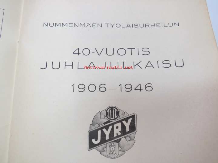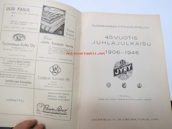 Toimittaneet Eino Lehtinen, Paavo Aitio, Lauri Verho, Turun Jyry, 1946Nummenmäen työläisurheilun 40-vuotis Juhla-Julkaisu 1906-1946, sis. mm. seur. artikkelit; Eino Lehtinen - Neljä vuosikymmentä työläisurheilutoimintaa Nummenmäellä, Eero Leino - Muistelmia uinti- ja kylpylätoiminnan alkuajoilta Kaarinassa, V.J. Saaristo - Urheilutoiminta Itäharjun omakotialueella, Unto Otava - Reippaan pesäpalloilun harrastus, Gunnar Kankare - Välähdyksiä hiihtourheilun harrastuksesta Nummenmäellä, V.J. Saaristo - Turun Jyryn alkutaipaleelta, Rakel Tammi - Muistelmia Kirin naisten toiminnasta, Into Palkén - Katsaus Nummenmäen jalkapalloiluun, ym.