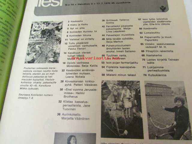 Kotiliesi 1970 nr 14 -Heinäkuu mm. kesäkuun vieraat tulivat idästä - Intian presidentin ja Persian shaahin vierailu, opisto vanhassa Moisiossa, kesämökki emännän toiveiden mukaan Haapasaaristo -Pitkäluoto, kesämatto virkaten. neljä sukupolvea: Anna Ruohonen, Elma Turunen, Juhani Turunen ja Mika Turunen. Vihkikuva Arto Sarvi ja Anneli Lampo21 x 29 cm.