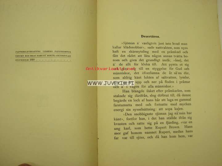 | Saatavilla | 1 kpl | | Julkaisuvuosi | 1910 | | Sivuja | 229 | | Painos | 1. | | Kunto | K3 | | Sidonta/painoasu | Nidottu (pehmeäk.) | | Kielet | Ruotsi |