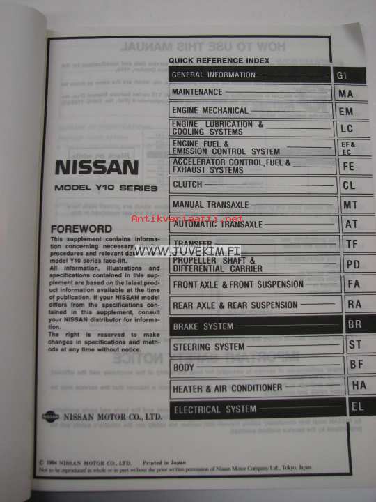 Nissan Y10 service manual supplement III -korjaamokirjan lisäosa