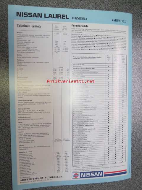 Nissan Laurel 4-ovinen Sedan, DL, SGL, 2,0 bens., 2,8 dies., 4-vaiht., 5-vaiht, autom. -myyntiesite