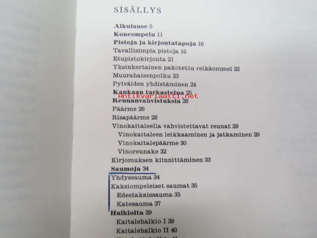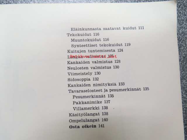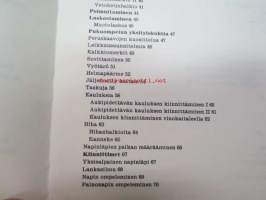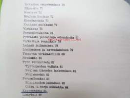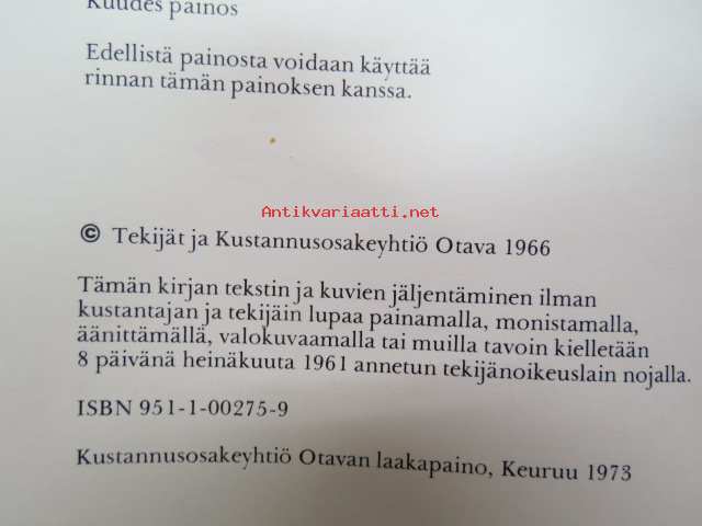 | Saatavilla | 1 kpl | | Julkaisuvuosi | 1973 | | Sivuja | 142 | | Painos | 6. | | Kunto | K3 | | Sidonta/painoasu | Nidottu (pehmeäk.) | | ISBN | 951-1-00275-9 | | Kielet | Suomi |