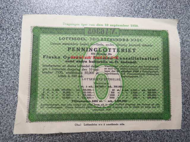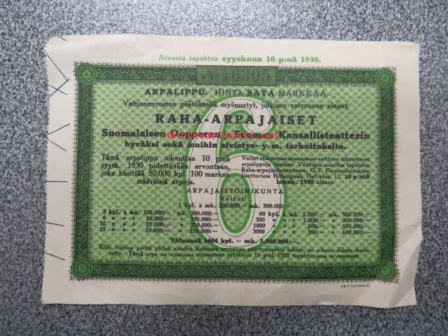 Raha-arpa, Raha-arpajaiset / Penninglotteriet, Arpalippu - Lottsedel 6 / 1930 nr 46305