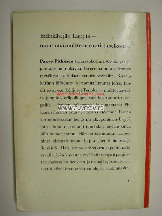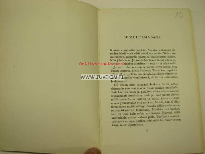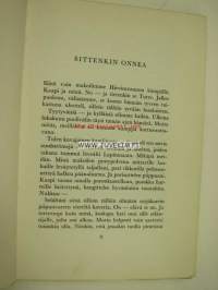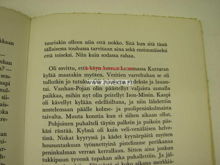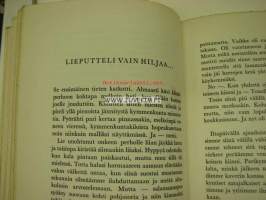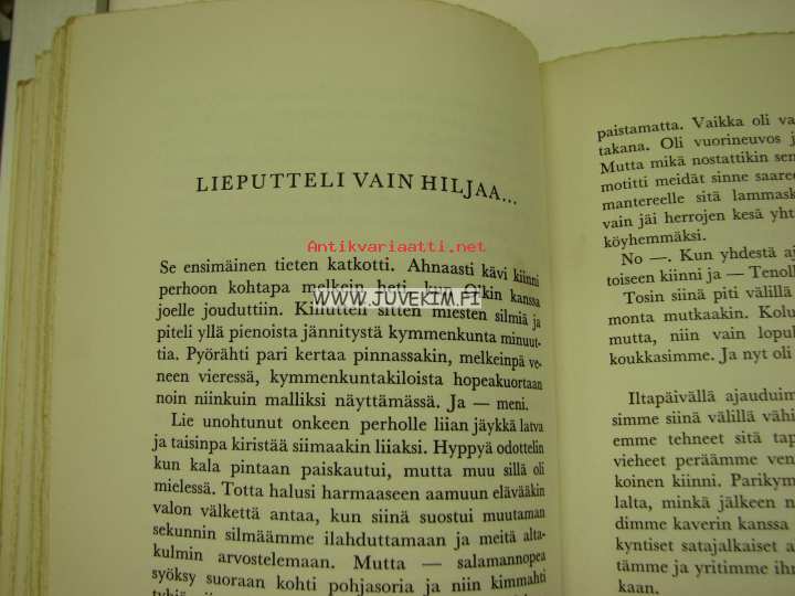 | Saatavilla | 1 kpl | | Julkaisuvuosi | 196? | | Sivuja | 134 | | Painos | 1. | | Kunto | K2 | | alkusivuja puuttuu, tekstiosa täydellinen | | Sidonta/painoasu | Nidottu (pehmeäk.) | | Kielet | Suomi |