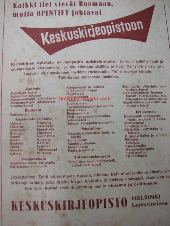 | Saatavilla | 1 kpl | | Julkaisuvuosi | 1952 | | Sivuja | 259 | | Kunto | K3 | | Sidonta/painoasu | Sidottu (kovak.) | | Kielet | Suomi |