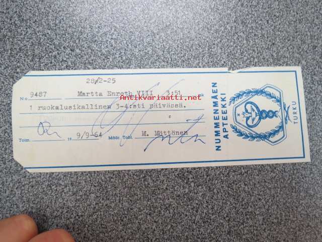 Nummenmäen Apteekki, Turku, 9.9.1964 -apteekkisignatuuri