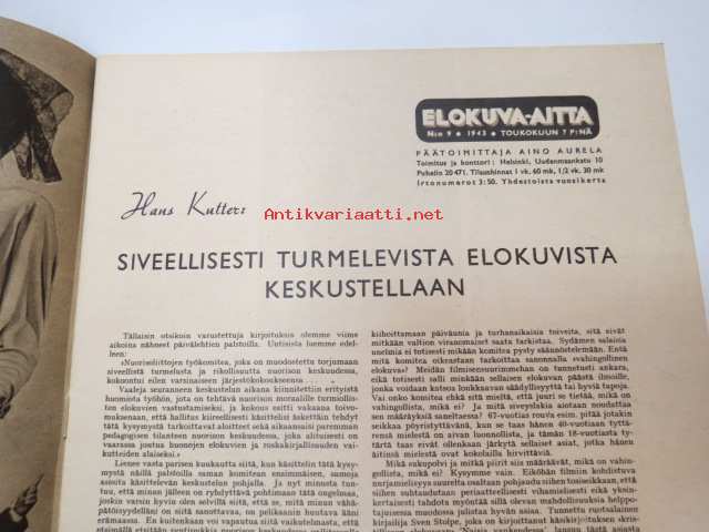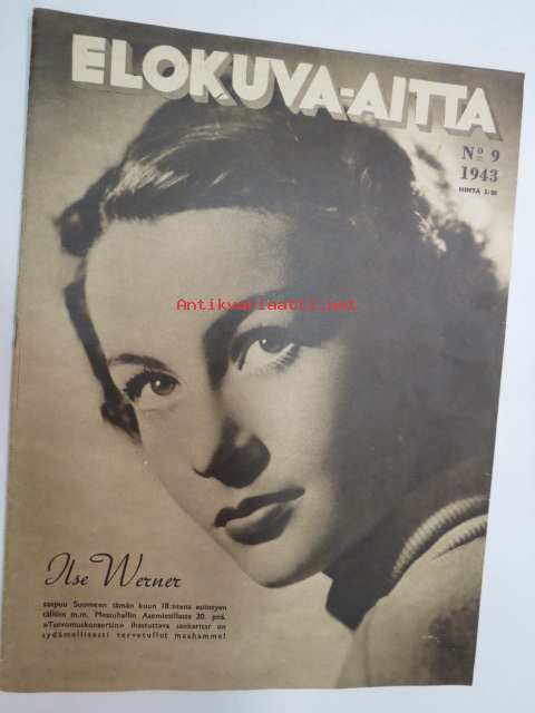 Elokuva-Aitta 1943 nr 9 sis. mm. seur. artikkelit / kuvat; Kansikuvassa Ilse Werner, Bette Davis - Hän, joka tuli päivälliselle, Siveellisesti turmelevista elokuvista keskustellaan, Kerttu Salmi, Jean Gabin, Mervi Järventaus, ym.22 x 29 cm.