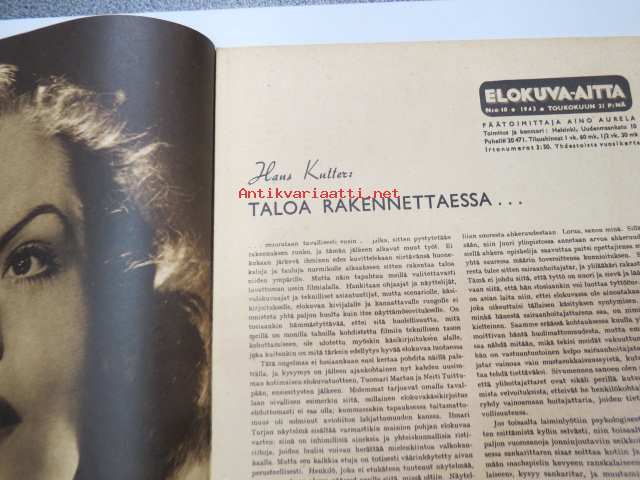 Elokuva-Aitta 1943 nr 10 sis. mm. seur. artikkelit / kuvat; Kansikuvassa Viviance Romance - Mustalaiskuningatar, Merirosvon tytär, Irma Seikkula, Emmi Jurkka, Filmin tekijöitä ja vähän muutakin kulissien takaa, Ilse Werner-kuumetta Helsingissä, Herra ohjaaja..., Olga Tschechowa, ym.22 x 29 cm.