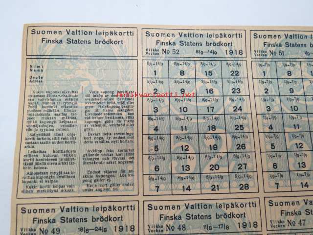 Suomen Valtion leipäkortti 1918 Finska statens brödkort viikot 38-52 -leikkaamaton, käyttämätön arkki -säännöstelykorttiarkki