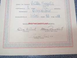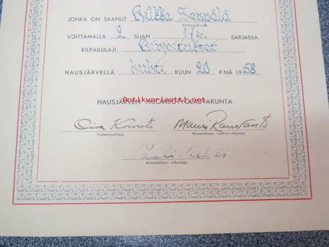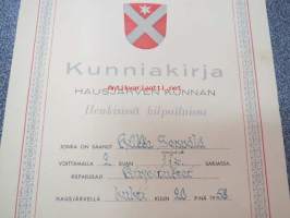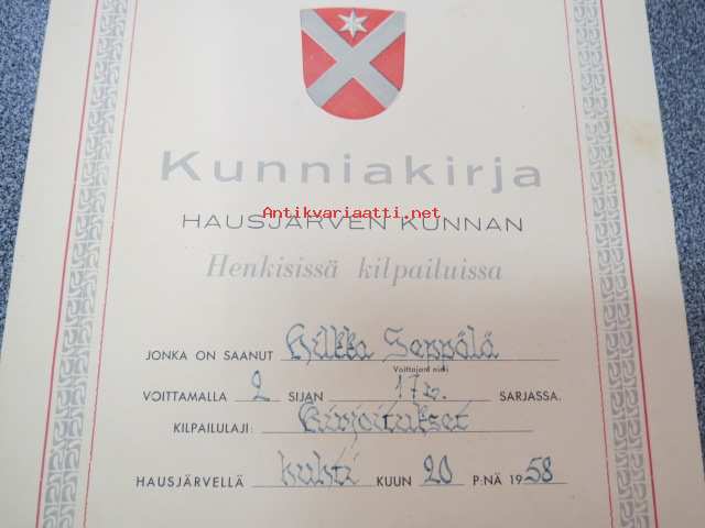 Kunniakirja Hausjärven kunnan Henkisissä kilpiluissa H.S. voittamalla 2. sijan 17 v. sarjassa. Kilpailulaji; Kirjoitukset., 20.4.1958