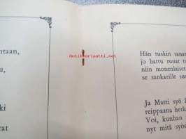 | Saatavilla | 1 kpl | | Julkaisuvuosi | 1942 | | Sivuja | 16 | | Painos | 1. | | Kunto | K2 | | Sidonta/painoasu | Nidottu (pehmeäk.) | | Kielet | Suomi |