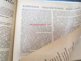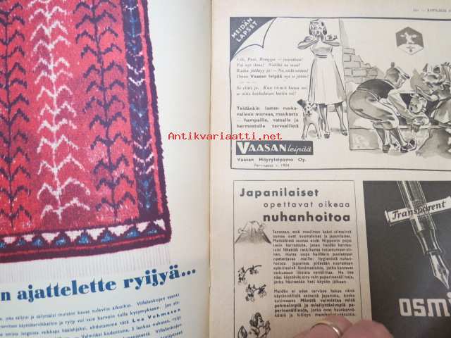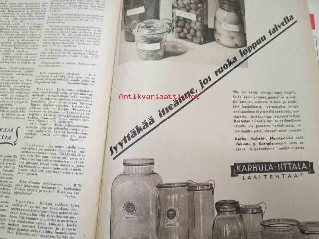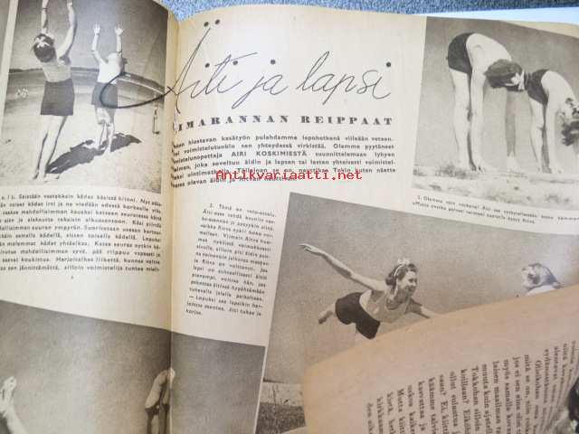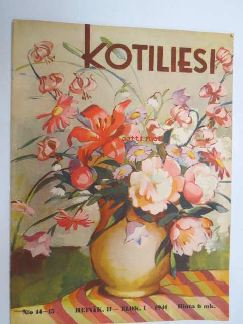 Kotiliesi 1941 nr 14-15 heinäkuun II - elokuun I sis. mm. seur. artikkelit / kuvat / mainokset; Kansikuvitus Martta Wendelin, Lea Vehmanen - Virike-ryijy, Säilöminen, Suuri vastuu kannetaan yhteisvoimin, Kodeista isänmaalle - kaatuneitten sotilaiden äitien esittelyä, Tohtori Varpu Leppo - vauvojen vaivat kesäkuumalla, Alttarin äärestä isänmaan asialle, Äiti ja lapsi - uimarannan reippaat, Mary Olki - Reikäompelu on kaunista taidetta, Kultamuuraimet, Kypsyvät marjat, Lehmän herkkua, Kieku ja Kaiku, Atamon, ym.21 x 29 cm.