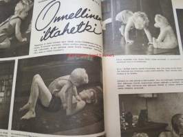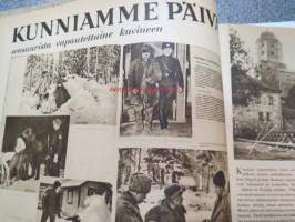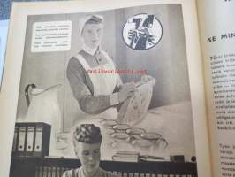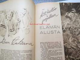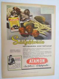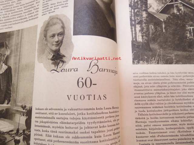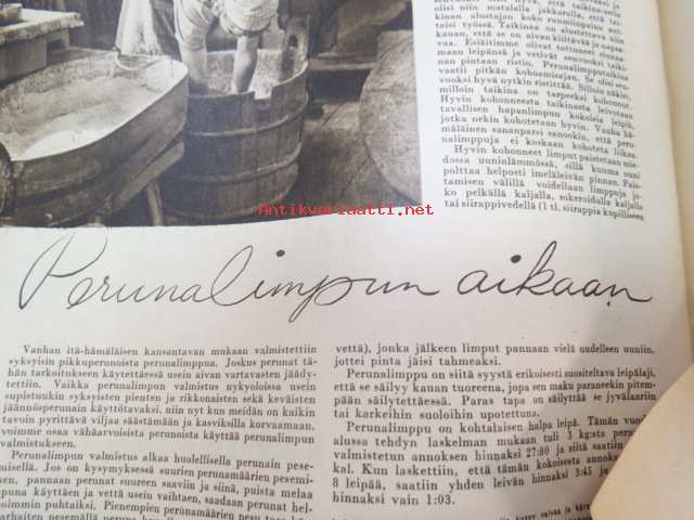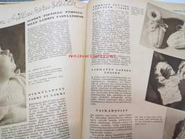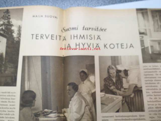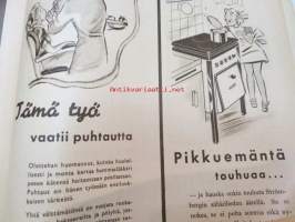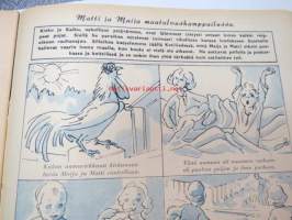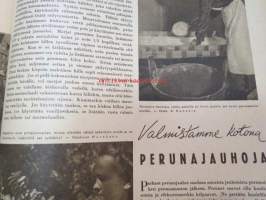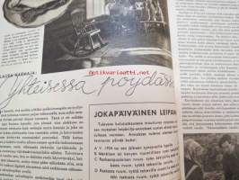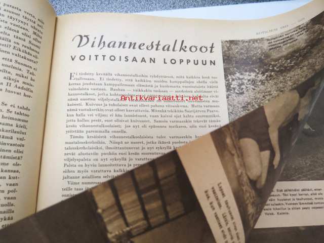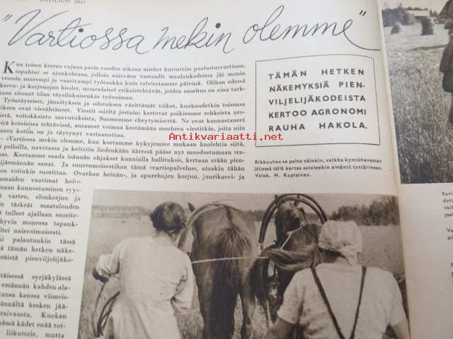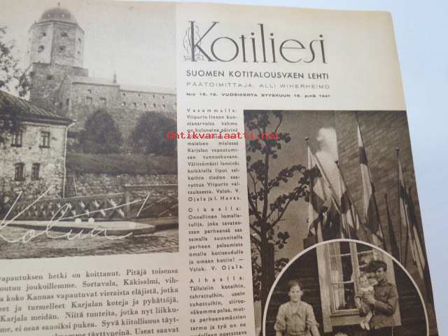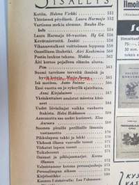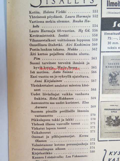 Kotiliesi 1941 nr 18 syyskuu II sis. mm. seur. artikkelit / kuvat / mainokset; Kansikuvitus Martta Wendelin, Säkistä parhaaksi pöytäliinaksi teko-ohje sivulla 2, Laura Harmaja (60-vuotias) - Yhteisessä pöydässä, Rauha Hakola - Vartiossa mekin olemme - tämän hetken näkemyksiä pienviljelijäkodeista, Vihannestalkoot voittoisaan loppuun, Onnellinen iltahetki, Äiti kertoo pohjalleen elämän alusta, Suomi tarvitsee terveitä ihmisiä ja hyviä koteja, Neulat ja puikot liikkuvat, Omenat ja pihlajan marjat, Perunalimpun aikaan, Matti ja Maija Maatalouskamppailussa-sarjakuva, Atamon, ym.21 x 29 cm.