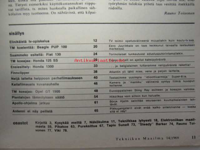 Tekniikan Maailma 1969 nr 14, sis. mm. seur. artikkelit / kuvat / mainokset; Pikakoe Helo Jet 150 nestekaasulämmitin, Koeajossa Opel GT 1900, 4 ratkaisua helppoon kaitafilmikuvaukseen Bauer C 3 - Canon Zoom 250 - Elmo Super 104 - Minolta Autopak 8-S3, Ajossa Honda 1300, Koeajossa Honda SS125A, Fiat 130, Koelentää Beagle Pup 100, Elinaikainen opiskelu TV-ruudun ääressä, katso sisältö kuvista tarkemmin.21 x 30 cm.