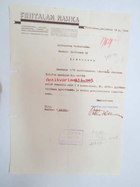 Friitalan Nahka, Ulvila, 18.12.1948 -asiakirja