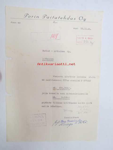 Porin Paitatehdas Oy, Pori, 26.10.1948 -asiakirja