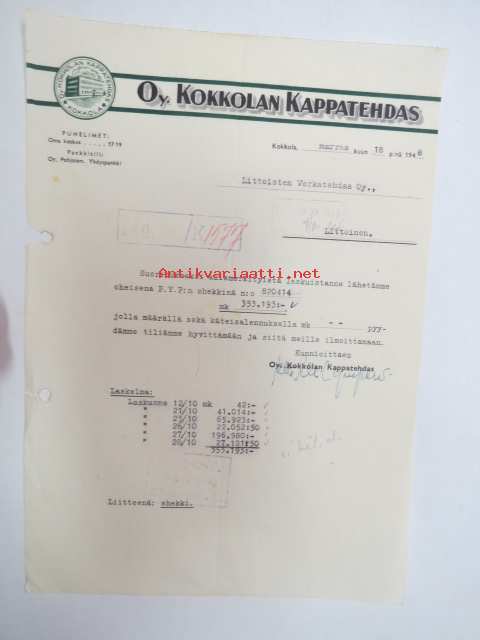 Oy Kokkolan Kappatehdas, Kokkola, 18.11.1948 -asiakirja
