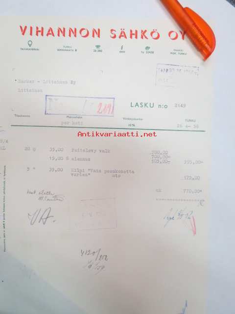 Vihannon Sähkö Oy, Turku, 26.4.1956 -asiakirja