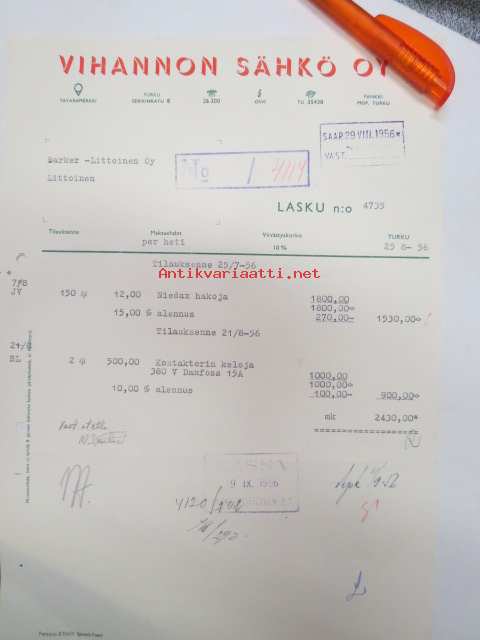 Vihannon Sähkö Oy, Turku, 25.8.1956 -asiakirja