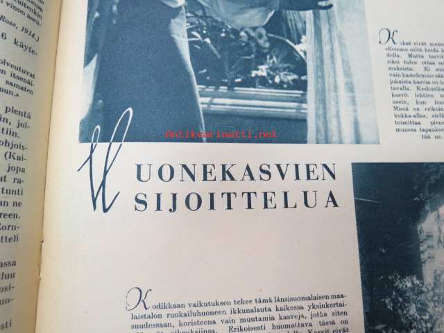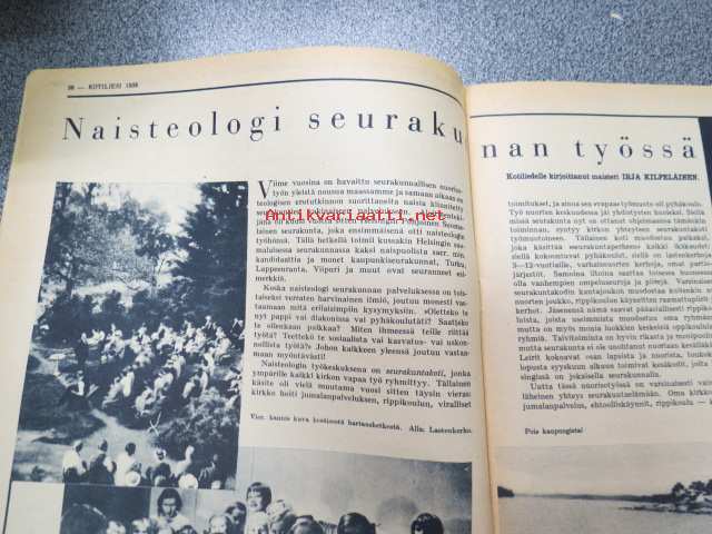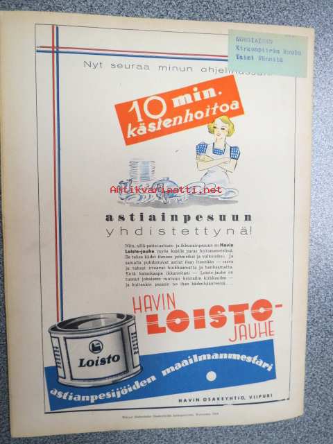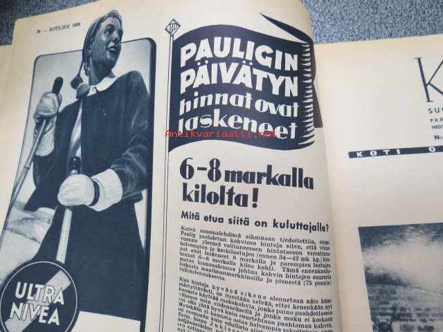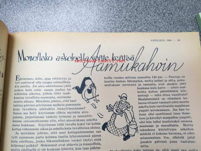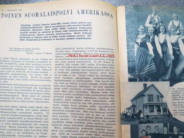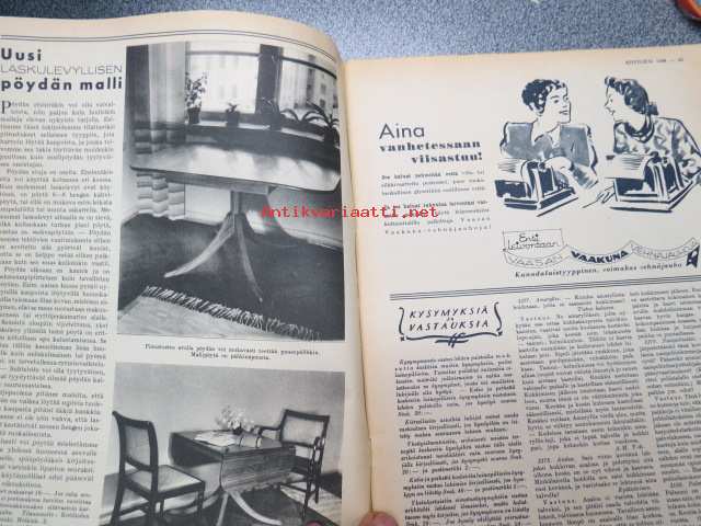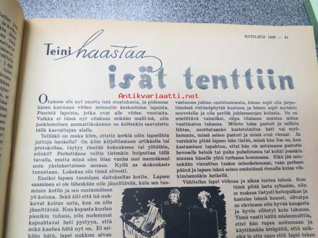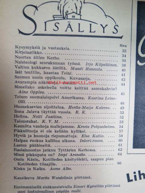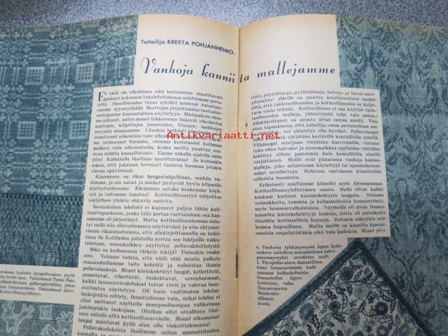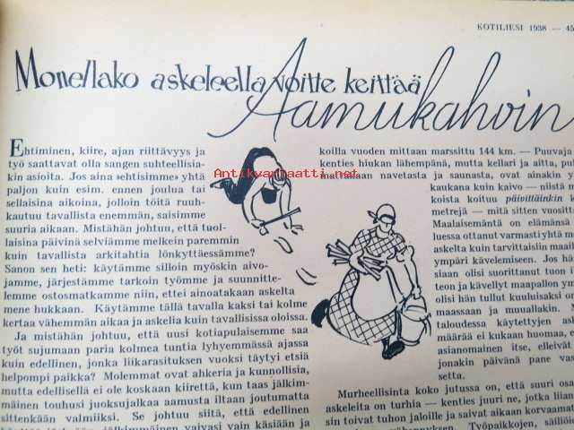 Kotiliesi 1938 nr 2, tammikuu II, sis. mm. seur artikkelit / kuvat / mainokset; Kansikuva Martta Wendelin, uusi laskulevyllisen pyödän malli, Kokous Suurkirkon partioluolassa, Naisteologi seurakunnan työssä, Suomalainen Yhteiskoulu - Helsinki - muuttanut uuteen rakennukseen, Monellako askeleella voitte keittää aamukahvin? Toinen suomalaispolvi Amerikassa, (kuvassa tyttöjä kansallispuku yllä). Huonekasvien sijoittelua, Ilona Jalava täyttää vuosia, Vanhoja liinamalleja käsitöihin, Riepumatto -tekoohjeita, , Kieku ja Kaiku, Havin Loisto -pesujauhe, ym.21 x 29 cm.
