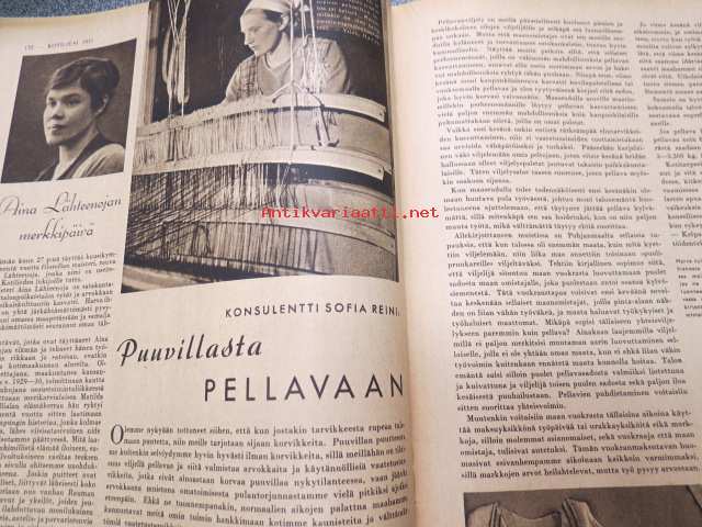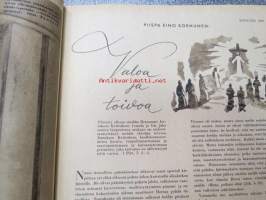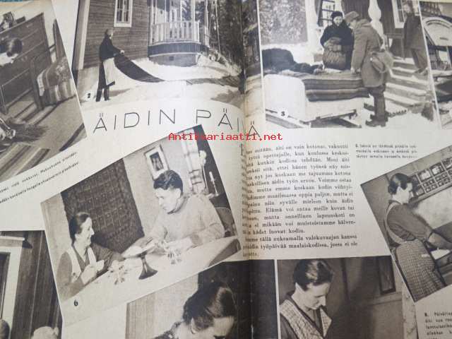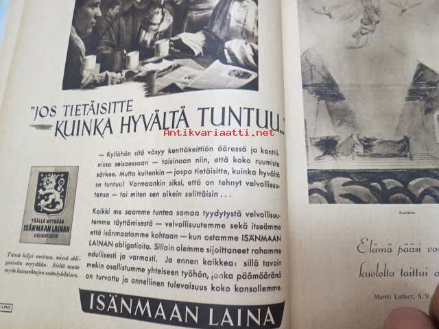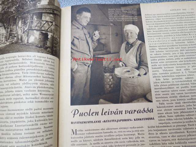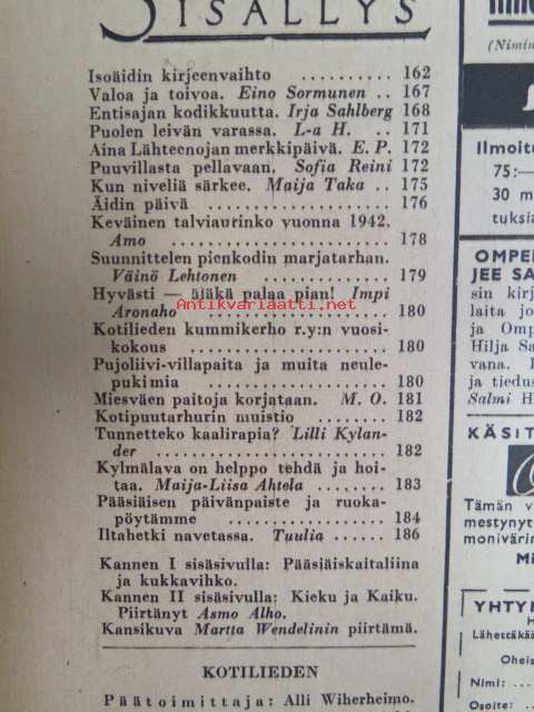 Kotiliesi 1942 nr 6, maaliskuu II, sis. mm. seur artikkelit / kuvat / mainokset; Kansikuva Martta Wendelin, Isänmaan laina, Entisajan kodikkuutta - Turku Luostarinmäki, Puolen leivän varassa, Puuvillasta pellavaan, Kun niveliä särkee, Suunnittelen pienkodin marjatarhan, Iltahetki navetassa, Asevelimalja, Kieku ja Kaiku, ym.21 x 29 cm.