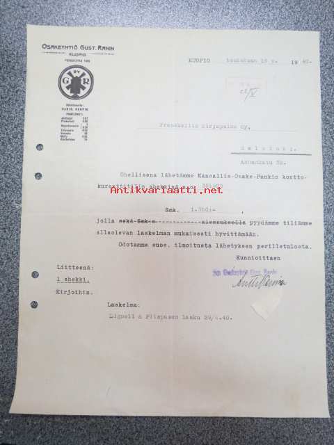 Gust. Ranin Oy, Kuopio, 16.5.1940 -asiakirja / firmalomake