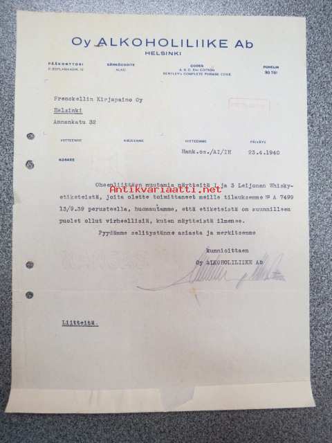 Oy Alkoholiliike Ab, Helsinki, 23.4.1940 -asiakirja / firmalomake
