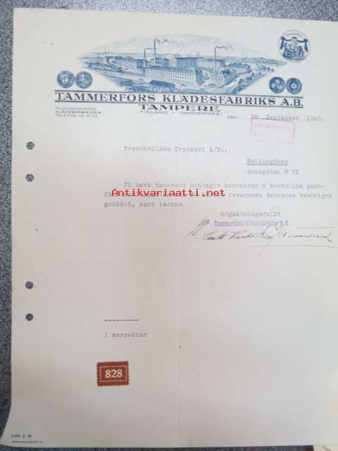 Tammerfors Klädesfabriks Ab, Tampere, 28.9.1940 -asiakirja / firmalomake