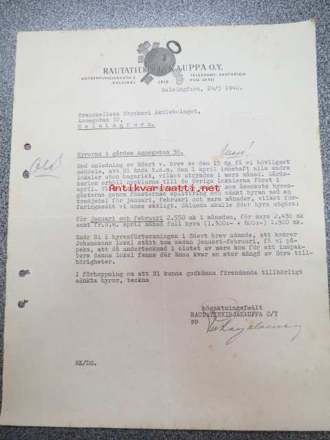 Rautatiekirjakauppa Oy, Helsinki, 24.5.1940 -asiakirja / firmalomake