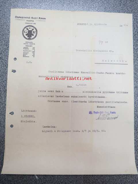 Gust. Ranin Oy, Kuopio, 5.9.1940 -asiakirja / firmalomake