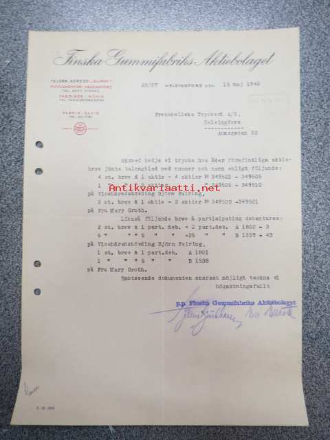 Finska Gummifabriks Ab (Nokia), Helsingfors, 15.5.1940 -asiakirja / firmalomake